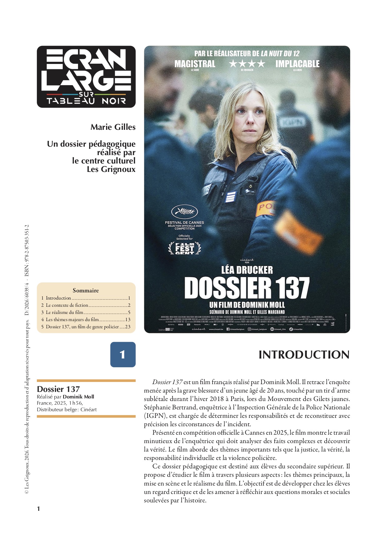 Dossier 137 est un film français réalisé par Dominik Moll. Il retrace l’enquête menée après la grave blessure d’un jeune âgé de 20 ans, touché par un tir d’arme sublétale durant l’hiver 2018 à Paris, lors du Mouvement des Gilets jaunes. Stéphanie Bertrand, enquêtrice à l’Inspection Générale de la Police Nationale (IGPN), est chargée de déterminer les responsabilités et de reconstituer avec précision les circonstances de l’incident.